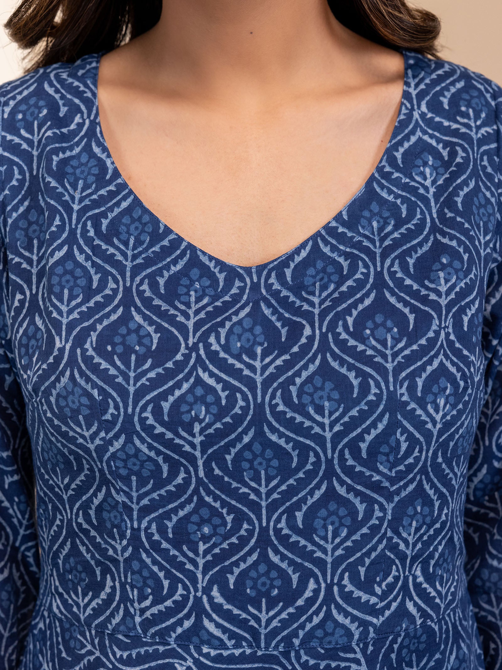 Experience the charm of heritage artistry with this Indigo Hand-Printed Voile Dress. Crafted in soft, breathable voile, it showcases intricate floral motifs inspired by Persian mihrab patterns — each detail brought to life through traditional Indian hand printing. The flattering fit-and-flare silhouette enhances movement, while the concealed side zipper ensures a seamless fit. Fully lined with voile for comfort and structure, this dress beautifully blends timeless craftsmanship with contemporary elegance, making it perfect for brunches, festive gatherings, or art-inspired wardrobes.