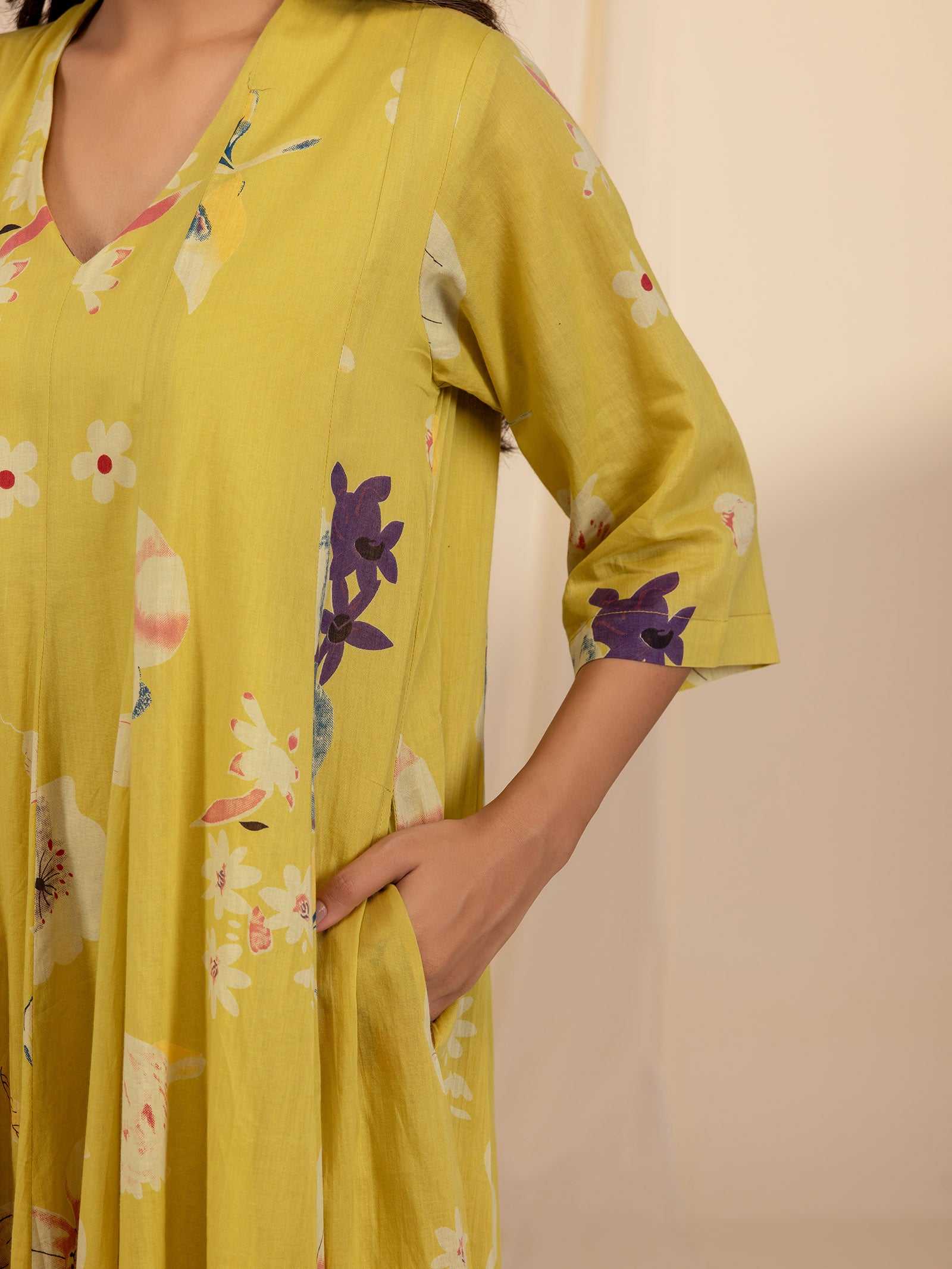 Brighten your wardrobe with this Ochre Mustard Floral Voile Dress, crafted to offer both elegance and everyday ease. Designed in a rich mustard hue with digitally printed floral patterns, this fit-and-flare silhouette is formed through carefully stitched panels that create graceful movement and a flattering drape. The V-neckline enhances its feminine charm, while discreet side pockets add a touch of practicality. Fully lined with soft voile and finished with fine French seams, this dress ensures all-day comfort and polished sophistication — perfect for brunches, vacations, or casual outings.