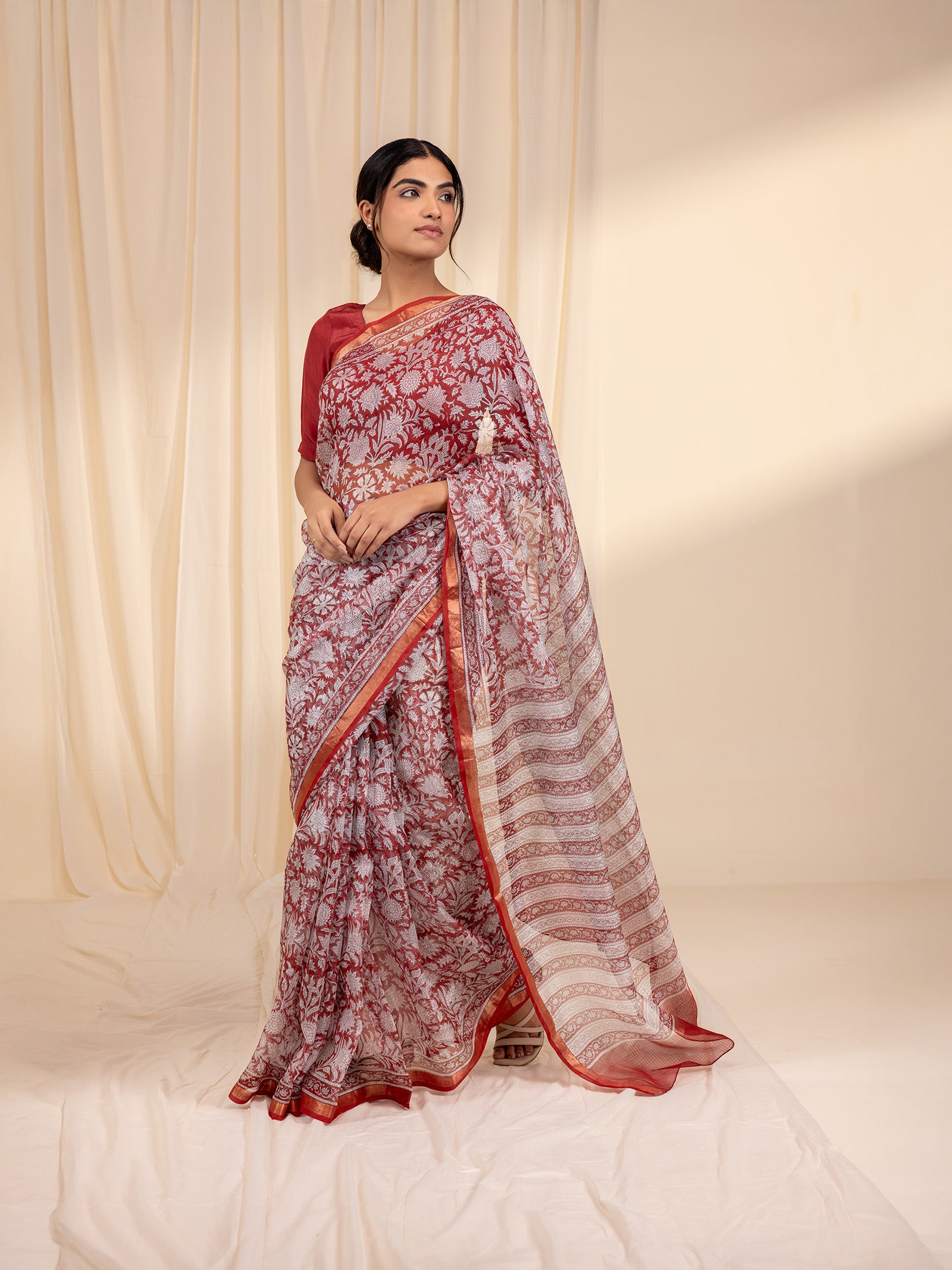 Bring heritage artistry to your wardrobe with this red Kota silk saree featuring intricate hand block-printed floral motifs in soft ivory tones. The finely detailed flowers and leaves create a striking contrast against the vibrant red base, inspired by Mughal-era botanical illustrations reimagined with a modern touch. Lightweight yet elegant, this saree drapes beautifully, making it ideal for festive gatherings, weddings, or cultural occasions. It is paired with a matching crepe blouse piece for a complete and graceful ensemble.